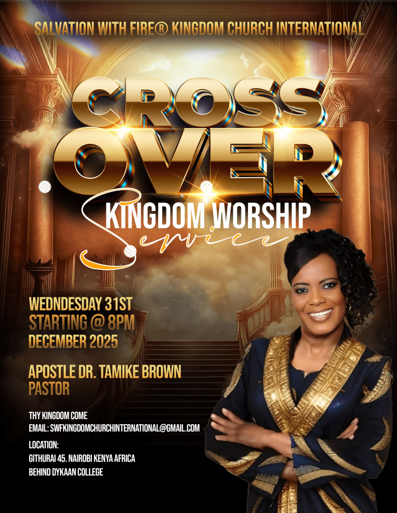 CROSSOVER KINGDOM WORSHIP SERVICE. DECEMBER 31ST AT SALVATION WITH FIRE® KINGDOM CHURCH INTERNATIONAL. APOSTLE DR. TAMIKE BROWN PASTOR. LOCATION GITHURAI 45. NAIROBI KENYA AFRICA 2025
