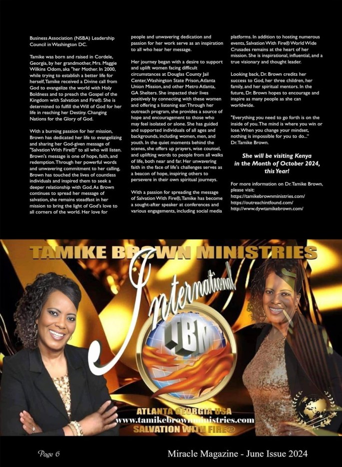 Dr. Evangelist Tamike Brown is an Anointed Woman of God. Founder and President of Outreach International Foundation Ministry since 2002, Tamike Brown Ministries, God Anointed Fire Vessels Television Network, TKKJ Video & Audio Production, Discover You With Tamike, LLC, Salvation With Fire® Television Broadcast via GAFV TV Network, and Salvation With Fire® Radio Show and TV Broadcast via The Glory Network.