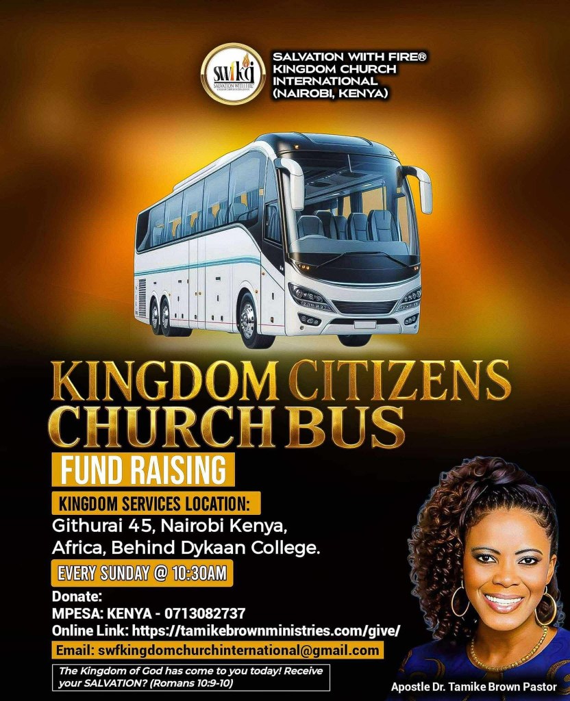 SALVATION WITH FIRE® KINGDOM CHURCH INTERNATIONAL. APOSTLE DR. TAMIKE BROWN PASTOR. LOCATION GITHURAI 45. NAIROBI KENYA AFRICA 2025. YOUR DONATIONS ARE GREATLY APPREACIATED. THANK YOU! KINGDOM CITIZENS CHURCH BUS. https://tamikebrownministries.com/give/