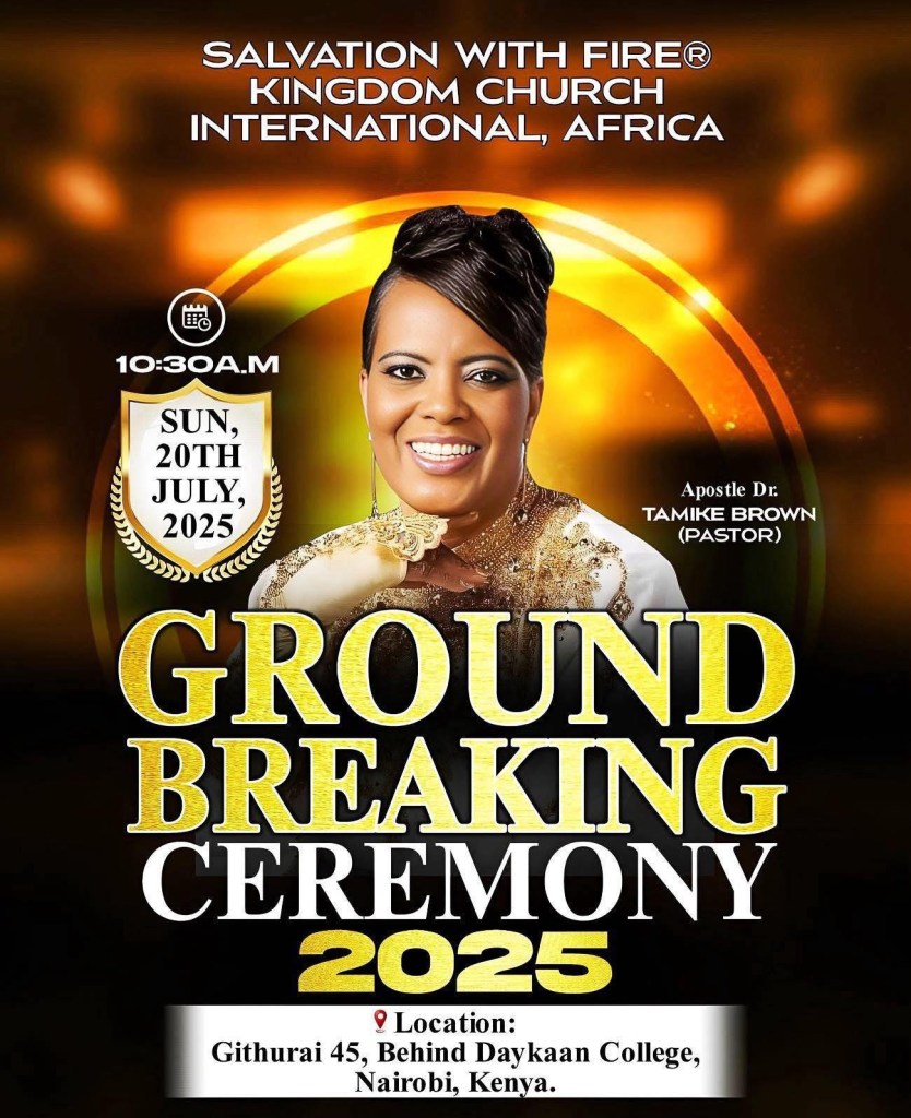 PASTORAL ORDINATION & GROUND BREAKING CEREMONY. SALVATION WITH FIRE® KINGDOM CHURCH INTERNATIONAL. APOSTLE DR. TAMIKE BROWN PASTOR. LOCATION GITHURAI 45. NAIROBI KENYA AFRICA JULY 20TH 2025